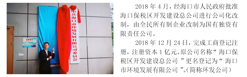 ??谑协h境發展有限公司是海口市屬國有獨資有限責任公司,于2018年12月正式掛牌運營,注冊資本1億元,由1993年12月成立的??诒6悈^開發建設總公司進行公司化改制而成,核心業務為環境環衛產業投資和運營、資產運營和管理,培育業務為工程管理